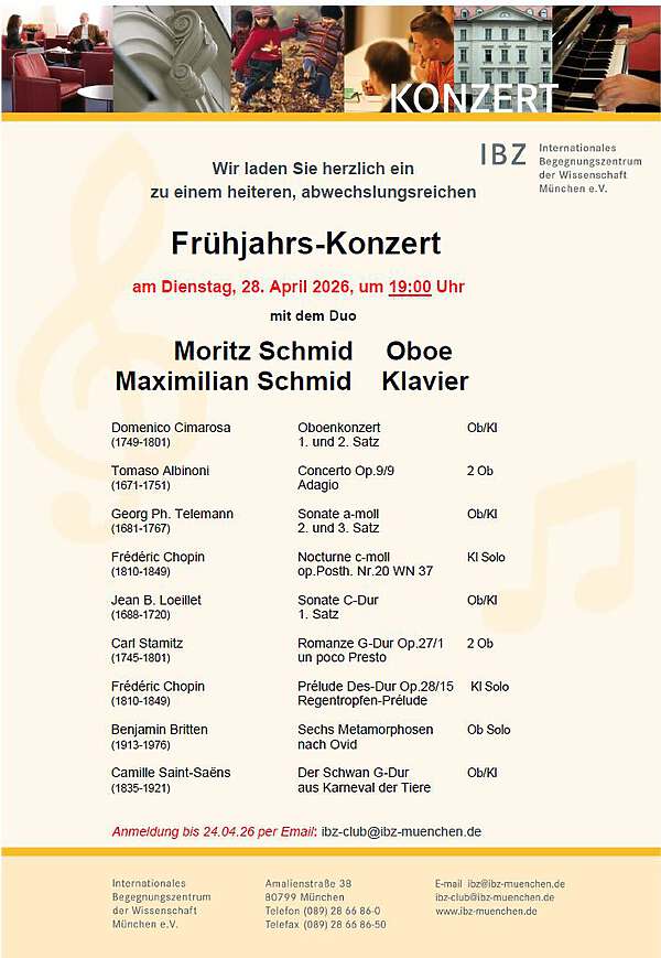 Rückblick Filmpremiere „Berlin - Friedrichstadtpalast" Festlicher Konzertabend 23.10.2025 Christo & Jeanne-Claude – Das lange Leben der vergänglichen Kunst (Dokumentarfilm) Ein bunter Blick auf Bulgarien 09.10.2024 18:30 Uhr Maria Kasimiva-Moase Eine Frage der Würde (BG 2023) Treffen mit Milena Fuchedzieva Vorweihnachtliche Konzert Klavier und Violine , 7. Dezember 2023 um 19:00 Bulgarien aus erster Person - Vortrag und Buchvorstellung, präsentiert von langjährigem Mitglied der DBV Prof. Dr. Juliana Roth Frühjahrs-Konzert mit dem Duo Moritz Schmid Oboe Maximilian Schmid Klavier Frühjahrs-Konzertam Dienstag, 28. April 2026, um 19:00 Uhrmit dem DuoMoritz Schmid OboeMaximilian Schmid Klavier IBZ Amalienstr. 38 80779 München Bildergalerie